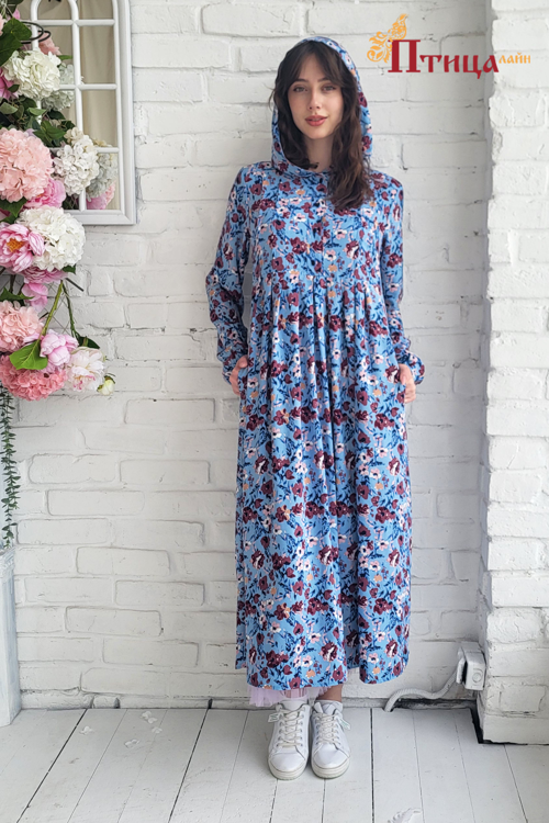 Платье женское с капюшоном отрезное по талии, линия талии завышенная. Юбка широкая с со складками по центу изделия, по передней и задней части юбки, что создает дополнительную свободу в области талии и бедер. Р...