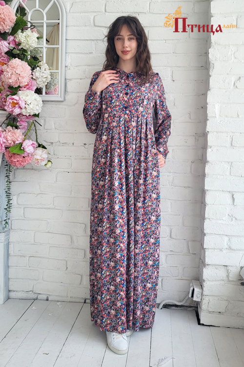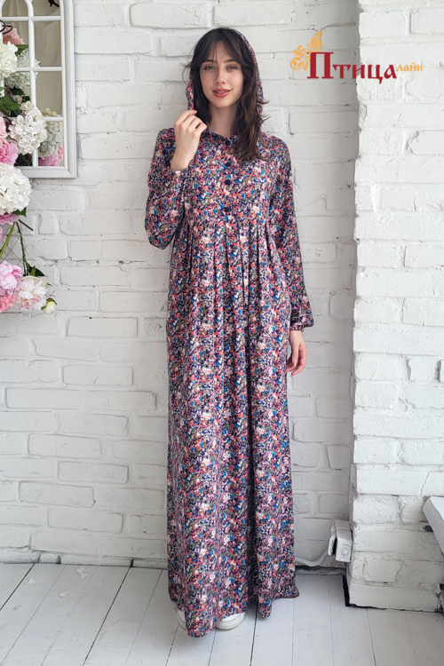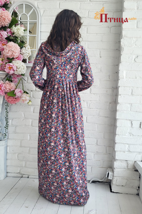 Платье женское с капюшоном отрезное по талии, линия талии завышенная. Юбка широкая с со складками по центу изделия, по передней и задней части юбки, что создает дополнительную свободу в области талии и бедер. Р...