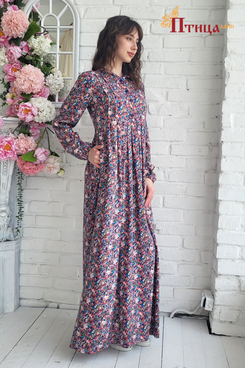 Платье женское с капюшоном отрезное по талии, линия талии завышенная. Юбка широкая с со складками по центу изделия, по передней и задней части юбки, что создает дополнительную свободу в области талии и бедер. Р...