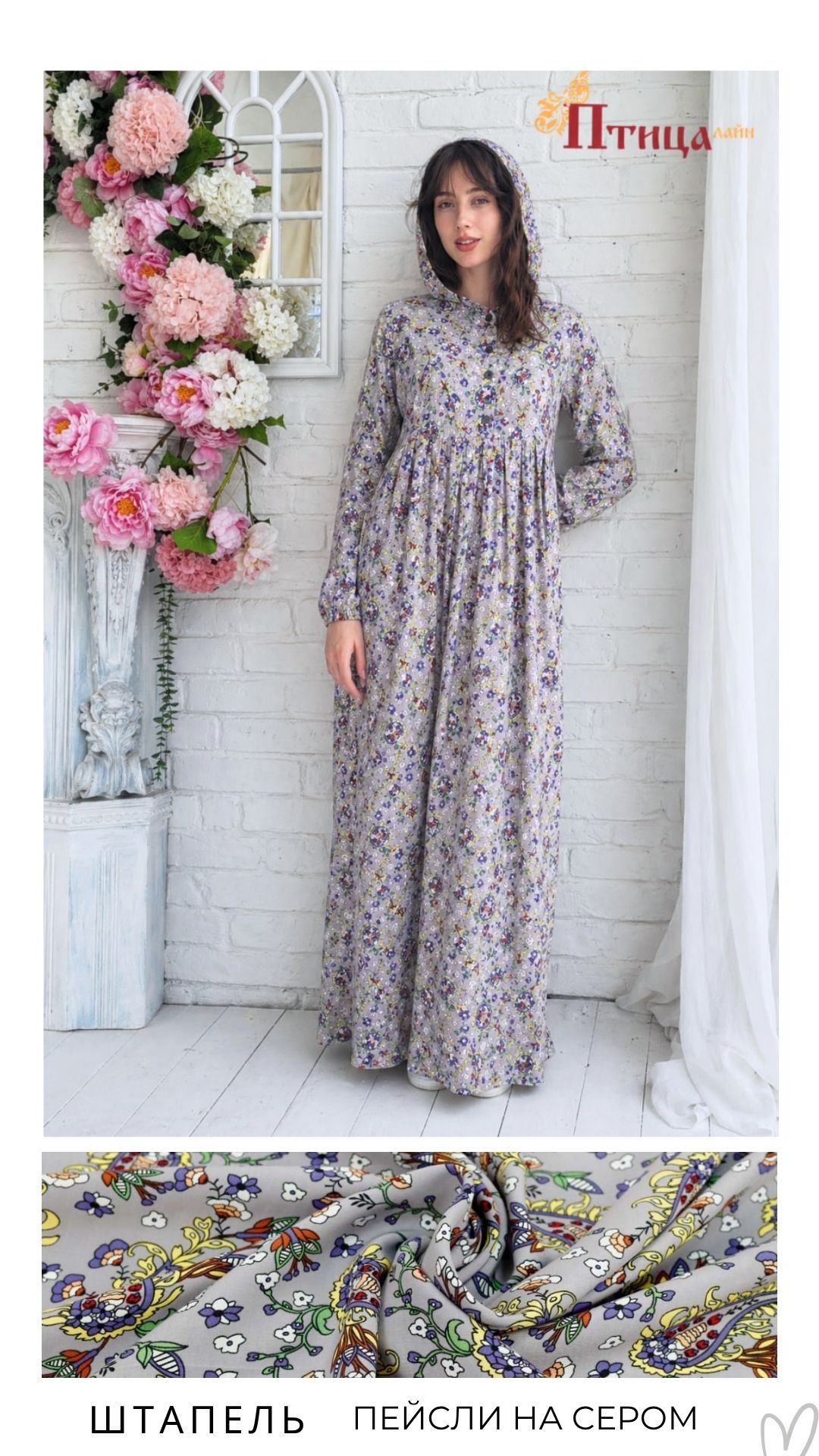 Платье женское с капюшоном отрезное по талии, линия талии завышенная. Юбка широкая с со складками по центу изделия, по передней и задней части юбки, что создает дополнительную свободу в области талии и бедер. Р...