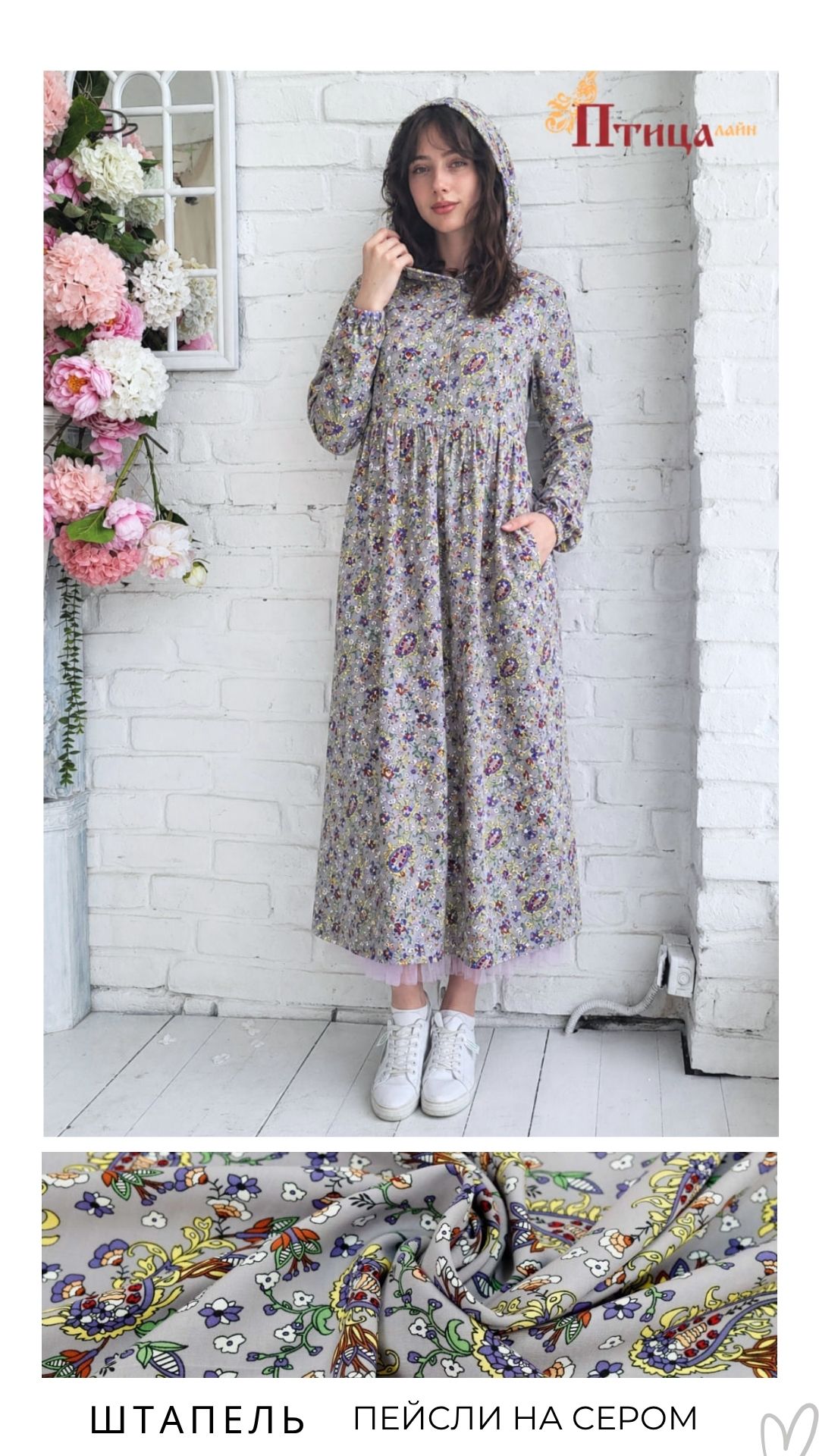 Платье женское с капюшоном отрезное по талии, линия талии завышенная. Юбка широкая с со складками по центу изделия, по передней и задней части юбки, что создает дополнительную свободу в области талии и бедер. Р...