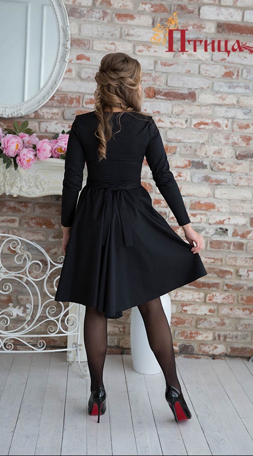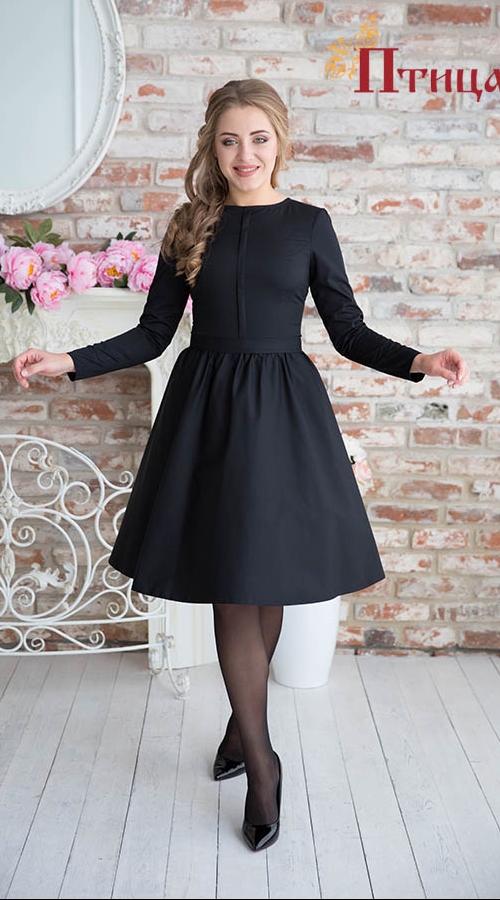 Женственное черное платье отрезное по талии. Длинна ниже колена. Юбка -полусолнце. Рукав втачной, прямой. Рельефные швы на полочке и спинке , обеспечивают хорошую посадку платья в любом размере. Для удобства, п...