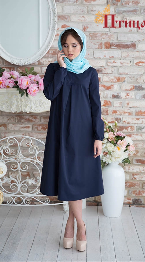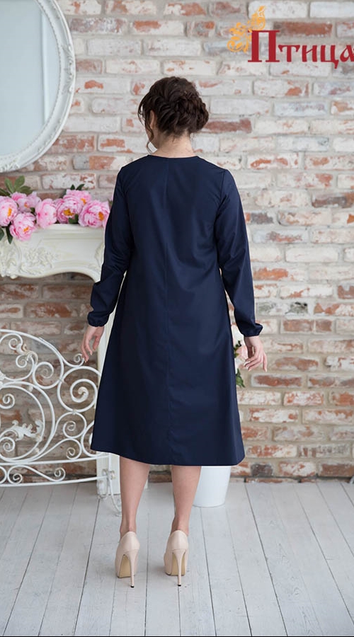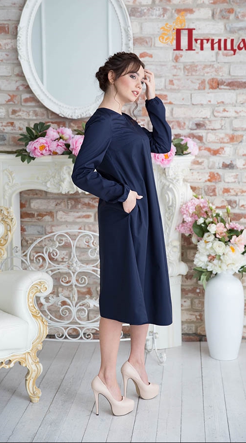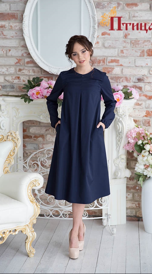 Платье женское трапециевидного силуэта. Рукав втачной на резинке. Платье идеально скрывающего все особенности фигуры. По центру полочки глубокая складка, и застежка на потайную молнию. Вырез горловины округлый....