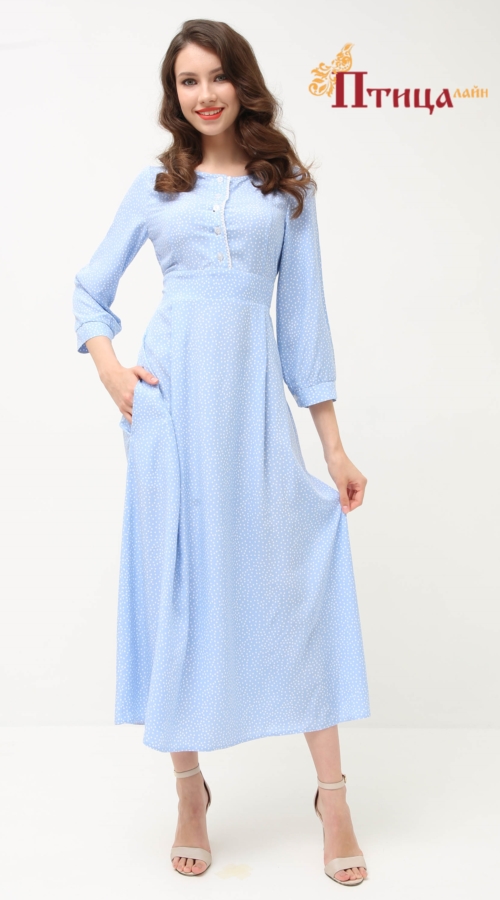 Платье женское отрезное с втачным поясом, линия талии завышенная. Юбка расклешенная к низу с карманами в боковом шве. Рукав втачной, широкий, длиной 3/4, низ рукава собран на мандету с пуговкой. Рельефы на пол...