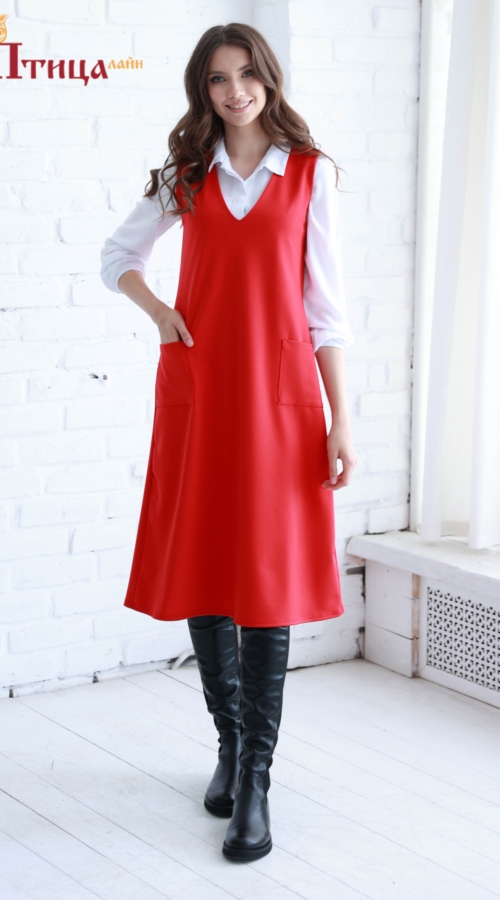 Сарафан трапециевидного силуэта, с настрочными карманами, всегда удобными для повседневной носки. Лаконичный, удобный, прекрасно сочетается с романтичными блузами, удобными водолазками. Длина изделия хорошо смо...