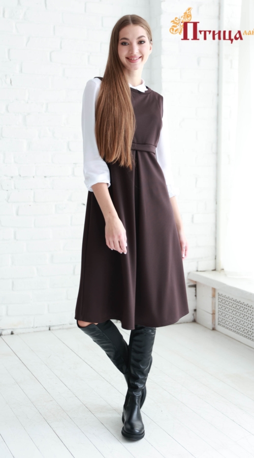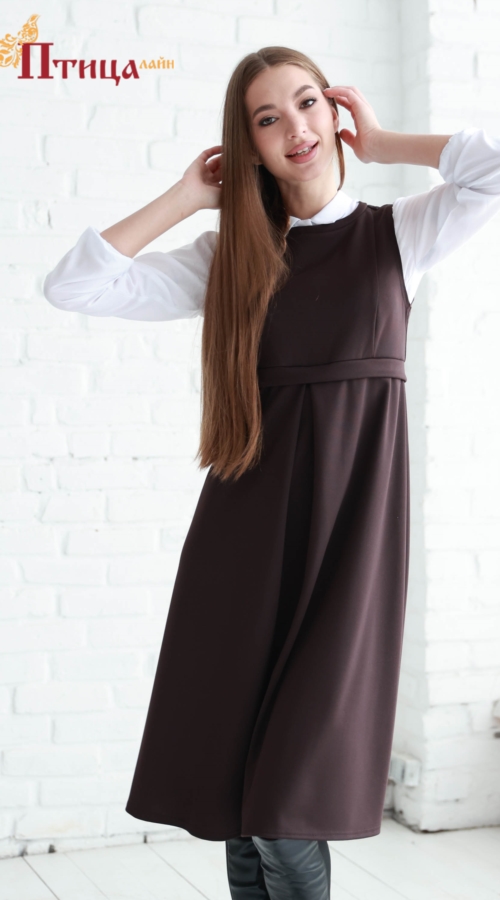 Теплый трикотажный сарафан за колено, с завышенной линией талии. Линия талии подчеркнута поясочком, юбка со встречной складкой создает женственный романтичный образ, позволяет носить данную модель каждой. По...