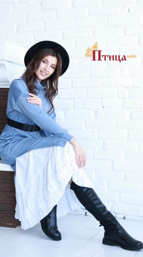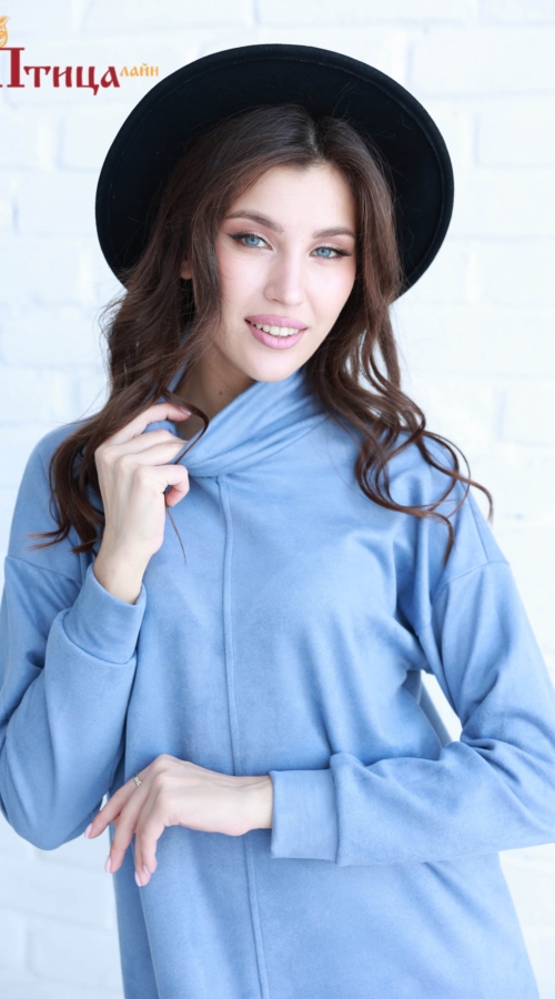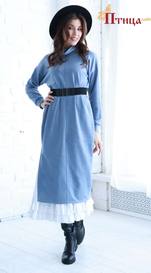 Платье свободного кроя, со спущенной линией плеча, силуэт платья напоминает "кокон," с закругленными боками и зауженной линией низа. Рукав с прямой линией притачивания рукава, низ рукава оформлен манжетой. ...