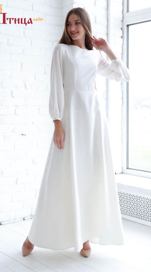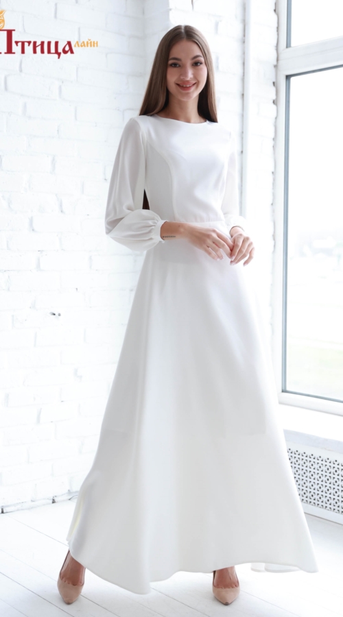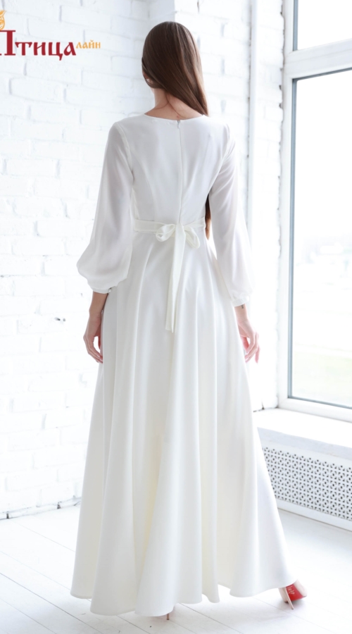 Отрезное по талии, платье полуприлегающего силуэта. Великолепная юбка полусолнце , создает контраст: осиной талии и богатой юбки, плывущей линии низа. Подъюбник в данном образе добавит контрастности и торжественности. Рукав очень нежный, длинный выполненый из легкого шифона на мажете.