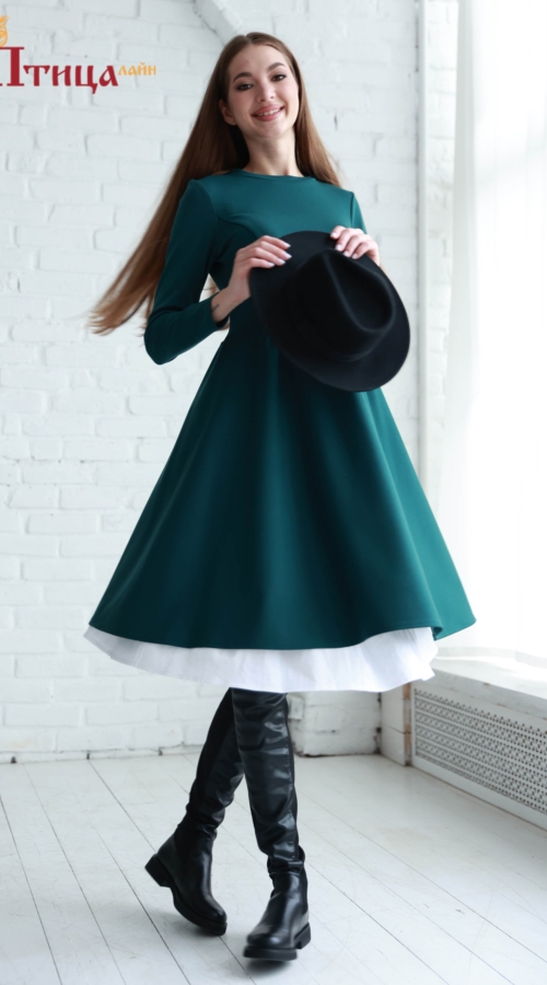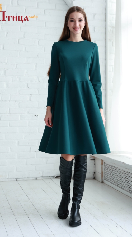 Теплое платье из трикотажа премиум класса с юбкой полусолнце, длиной за линию колена. Платье идеально сидит по фигуре, дополняя образ как с обувью на низком каблуке, так и на высоком. Приталенный силуэт созда...