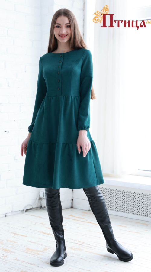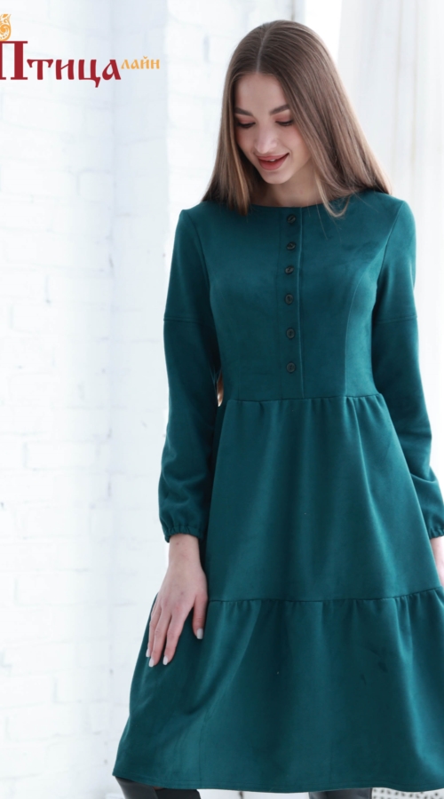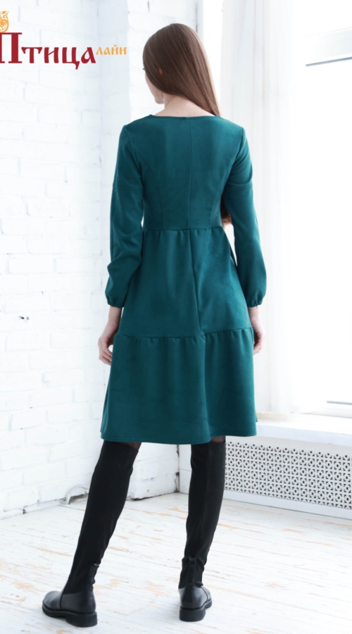 Платье отрезное по талии, полуприлегающего силуэта. Юбка расширенная к низу с легкой сборкой по талии, в два яруса на сборку. Рукав втачной с отстрочкой, расширенный к низу на резиночке. Вырез горловины лодочка...