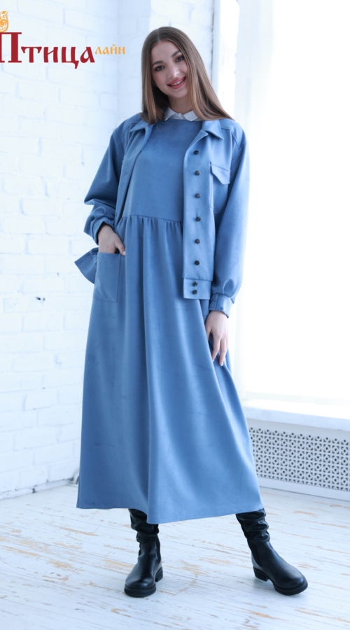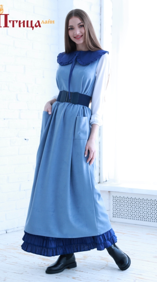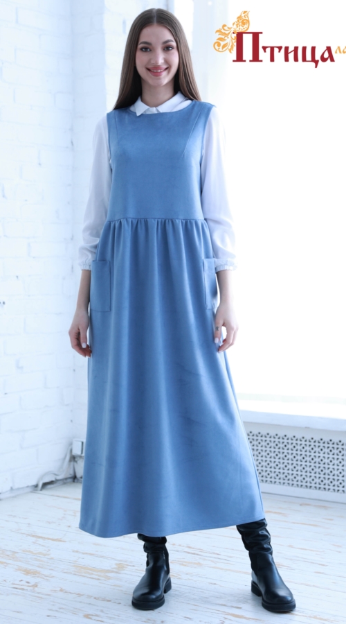 Сарафан с отрезной, завышенной линией талии. Юбка широкая, прямая. Равномерная сборка по линии талии украшает данный лаконичный образ. Идеальную посадку дарит нагрудная выточка, выходящая из плечевого шва. ...