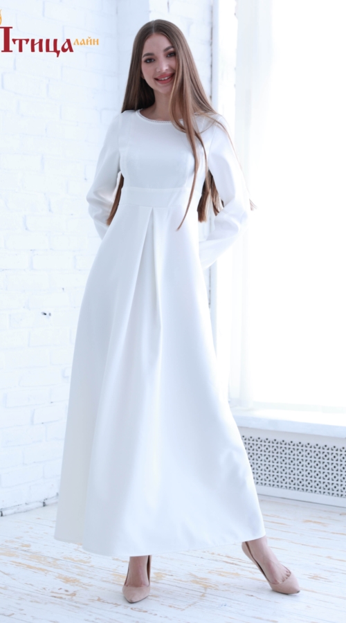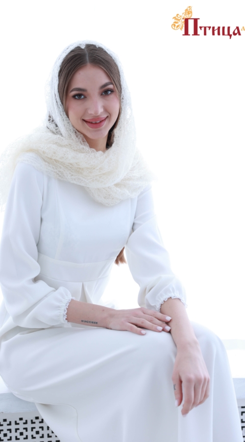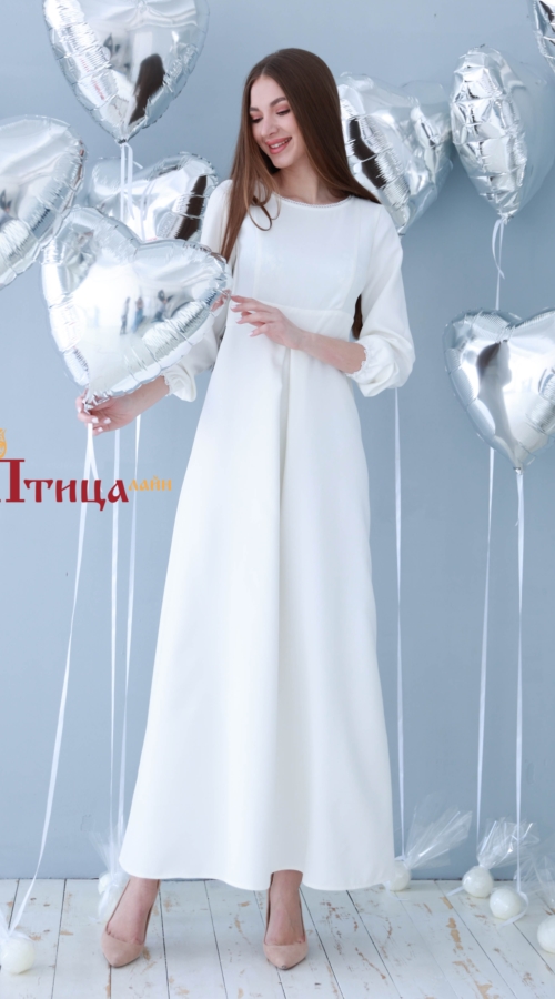 Нежный образ, приталенный силуэт, завышенная линия талии - более утонченного и идеального образа на венчание не возможно представить. Линия горловины и низ рукава украшен нежнейшим хлопковым, белым кружевом. Ю...