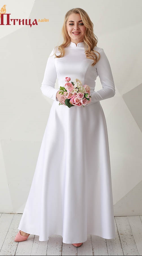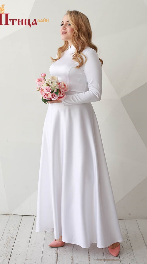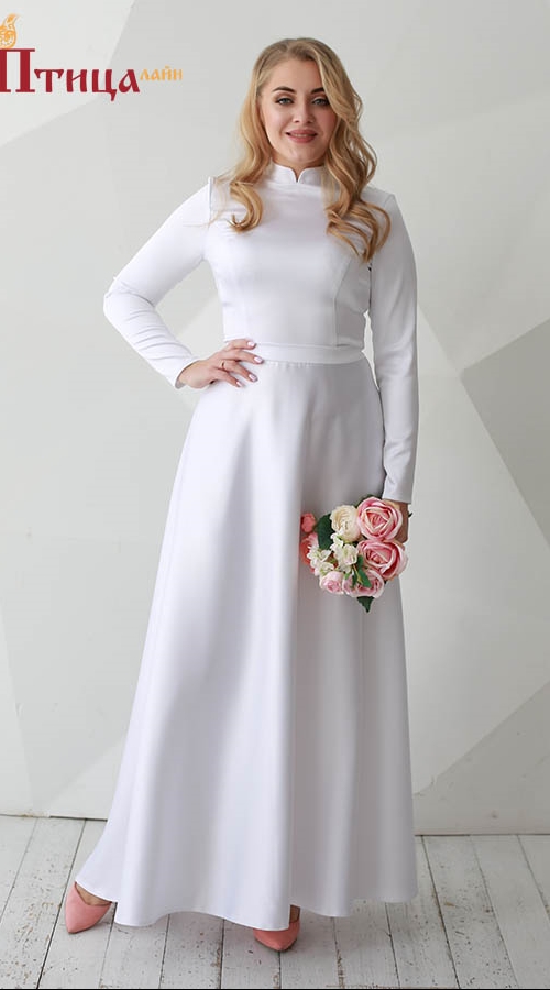 Отрезное по талии, платье полуприлегающего силуэта. Великолепная юбка полусолнце , создает контраст: осиной талии и богатой юбки, плывущей линии низа, подъюбник в данном образе добавит контраста и торжественности. Рукав втачной прямой немного зауженный к низу, длинный. Для удобства по среднему шву на спинке застежка на «молнию». Горловина украшена высокой стойкой, модель дополнена втачным поясом, который прекрасно приталивает изделие.