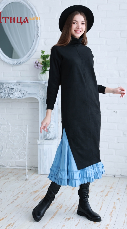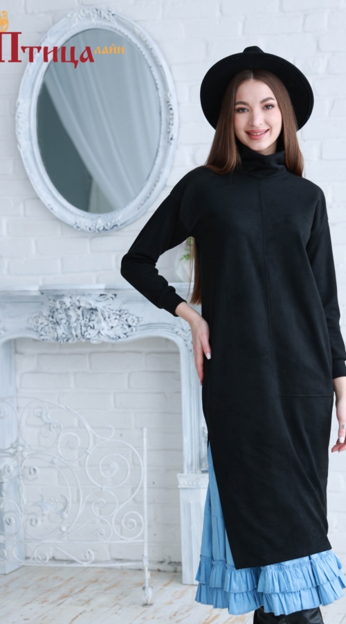 Рукав с прямой линией притачивания рукава, низ рукава оформлен манжетой. Платье выполнено из замши - плотного трикотажа, премиум класса , для удобства шага предусмотрен боковой разрез. Данная модель диктует мягкий, свободный, динамичный образ, прекрасно сочетающийся с спортивным, свободным стилем, но добавляя нежнейший штапельный подъюбник образ кардинально меняется, становясь нежным, мягким, романтичным.