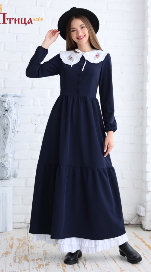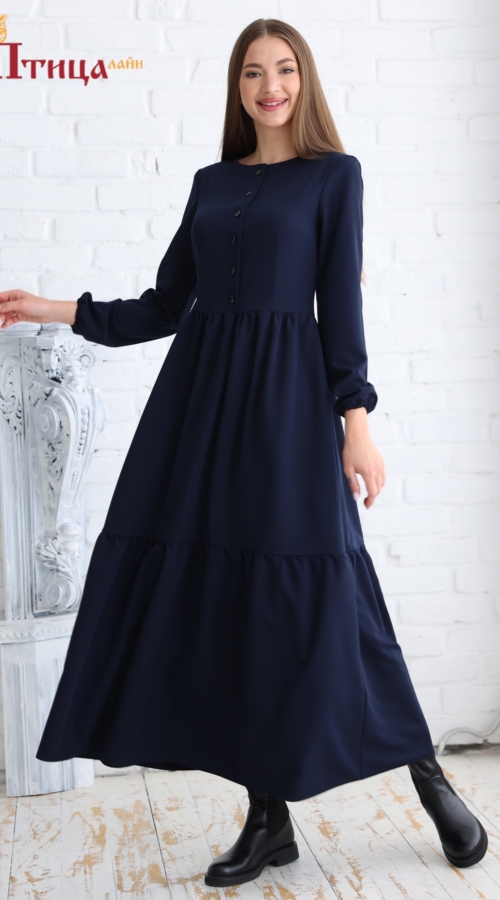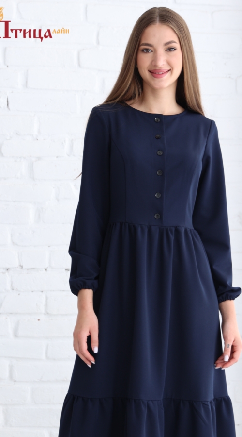 Платье женское отрезное по талии, полуприлегающего силуэта. Юбка расширенная к низу с легкой сборкой по талии, в два яруса на сборку. Рукав втачной, расширенный к низу на резиночке. Для удобства по среднему шву...