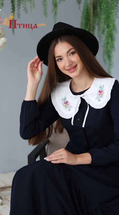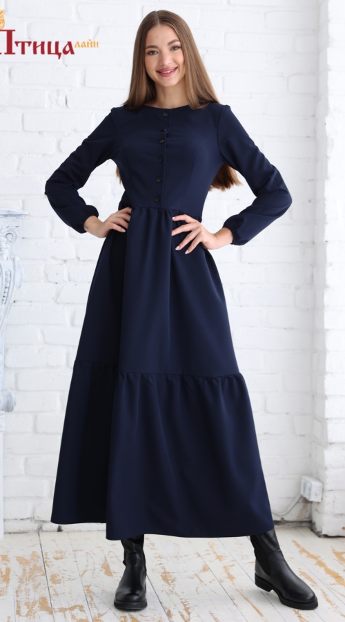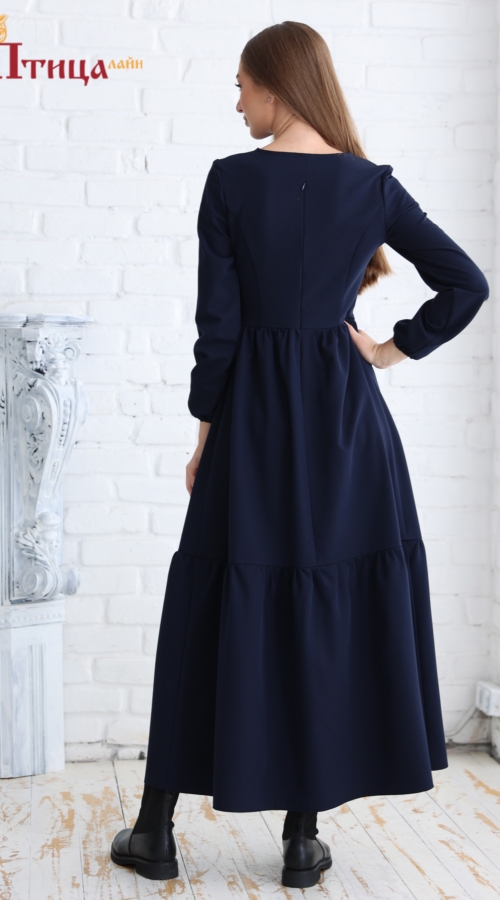 Платье женское отрезное по талии, полуприлегающего силуэта. Юбка расширенная к низу с легкой сборкой по талии, в два яруса на сборку. Рукав втачной, расширенный к низу на резиночке. Для удобства по среднему шву...