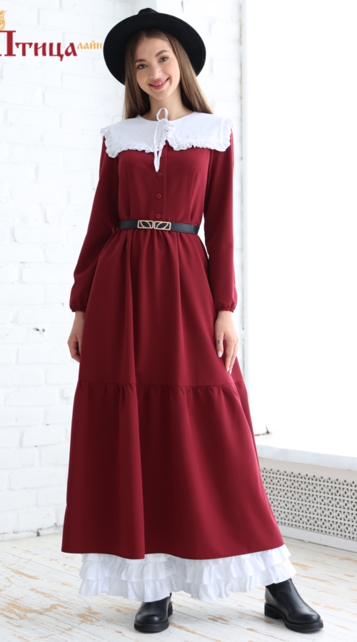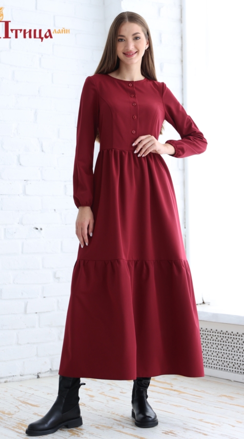 Платье женское отрезное по талии, полуприлегающего силуэта. Юбка расширенная к низу с легкой сборкой по талии, в два яруса на сборку. Рукав втачной, расширенный к низу на резиночке. Для удобства по среднему шву...