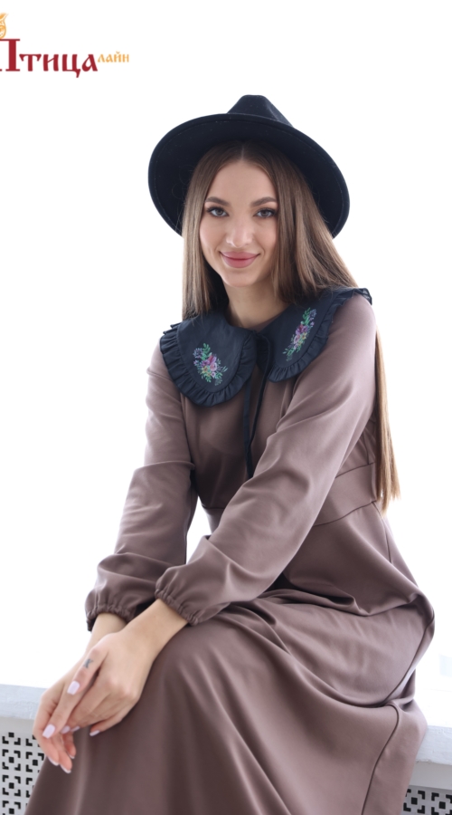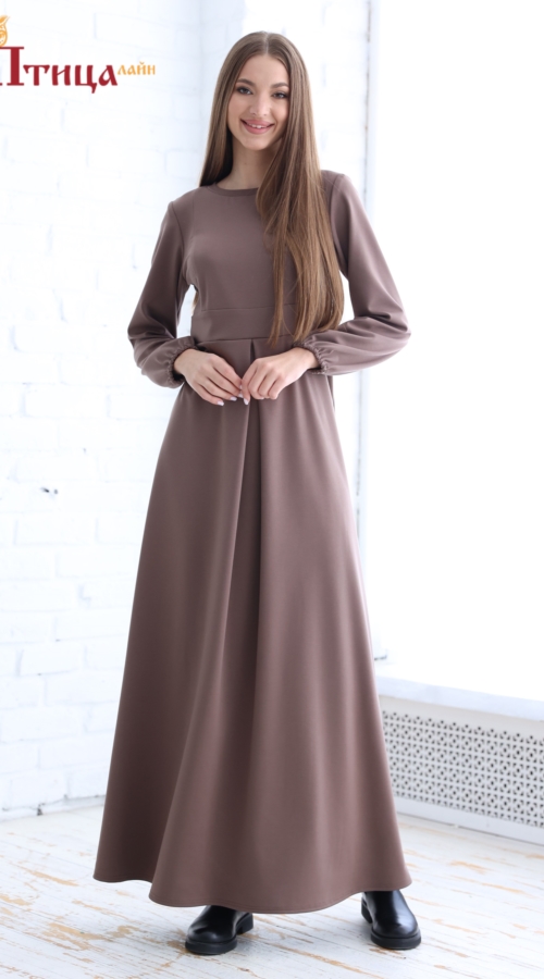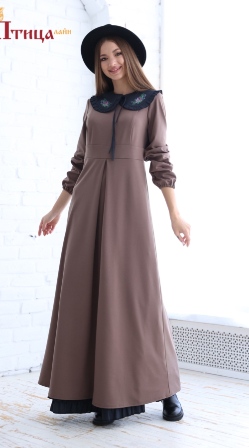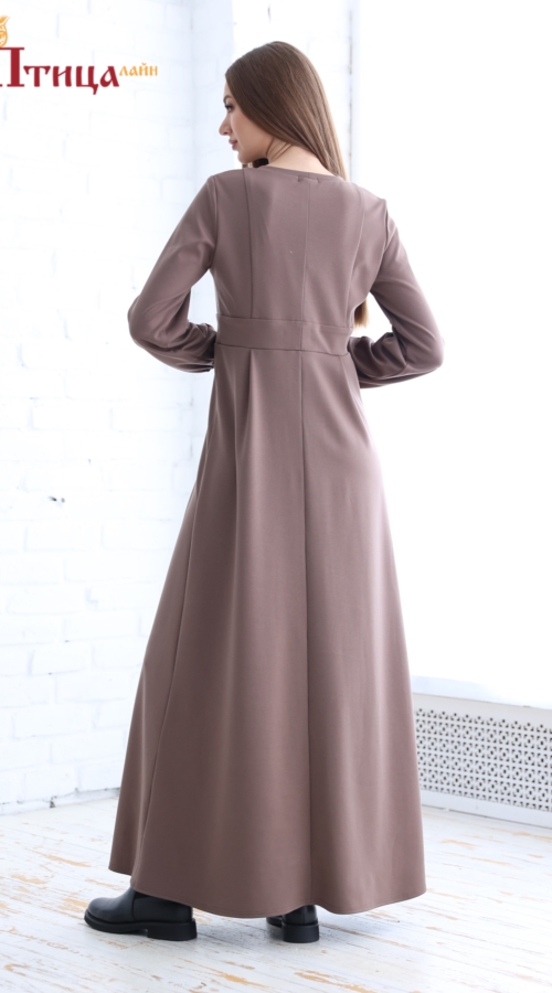 Платье отрезной по талии, линия талии завышенная. Юбка расклешенная к низу, по полочке встречная складка. Рельефы на полочке и спинке. По линии талии втачной пояс придает платью полуприлегающий силуэт. Украшени...