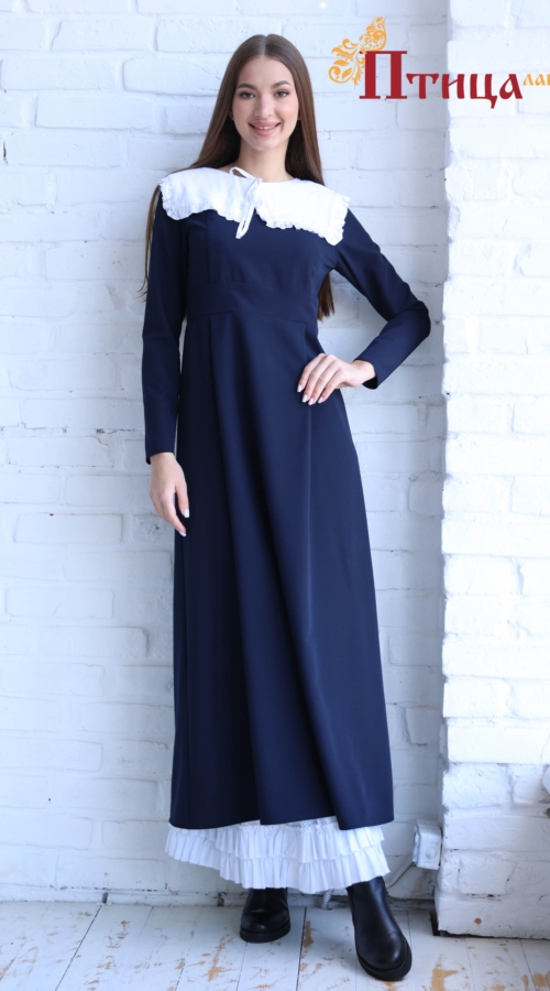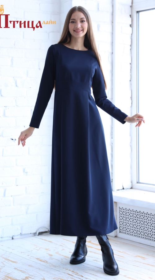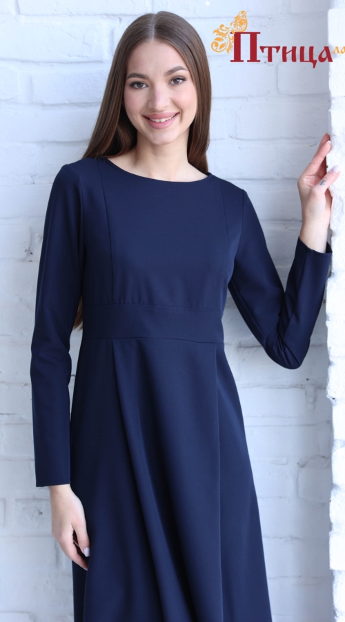 Платье женское отрезное по талии, линия талии завышенная, по линии талии втачной пояс. Юбка расклешенная к низу, с боковыми складками. Рукав втачной, прямой, зауженный к низу, длиный. Рельефы на полочке и спинк...