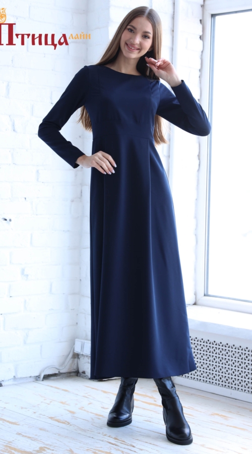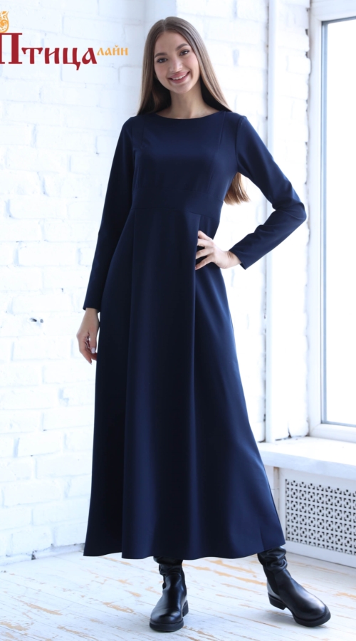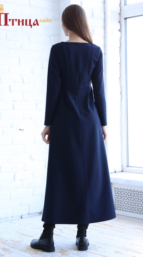 Платье женское отрезное по талии, линия талии завышенная, по линии талии втачной пояс. Юбка расклешенная к низу, с боковыми складками. Рукав втачной, прямой, зауженный к низу, длиный. Рельефы на полочке и спинк...