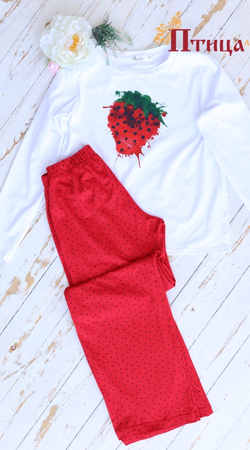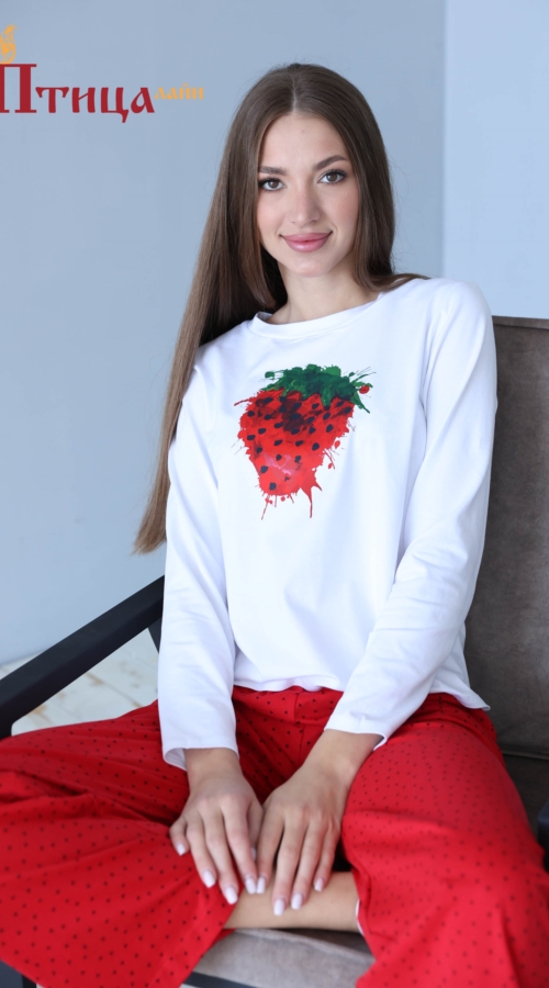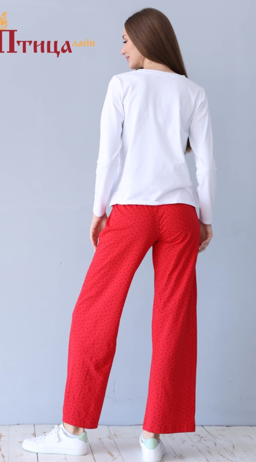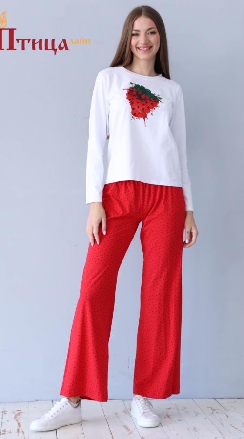 Пижама женская с брюками - невероятно удобный вариант одежды для дома и сна. Домашний костюм пошит из натурального хлопка, легкого и тактильно приятного материала. Пижама состоит из лонгслива и брюк. Комплект о...
